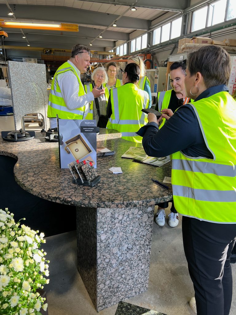Vierailulla pääsimme tutustumaan useisiin kivilaatuihin, kivikomposiitteihin ja keramiikkalaatuihin, eri tavoin työstettyihin malliryhmiin sekä luonnonkivien pintakäsittelyihin. Savo Design & Technicin omistaja Milla Savo esitteli uutuutena kivitasoon integroitavan keittotason.